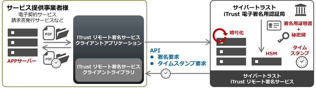 Azure、AWS やオンプレミスなど多様な動作環境に対応し、事業者のサービスへ短い工数で容易に「iTrust リモート署名サービス」を利用可能にします。月末月初など一度に電子インボイスの発行が集中する事業者に向けて、セキュアでスピーディーな電子署名とタイムスタンプの付与と通信負荷の軽減を支援します。