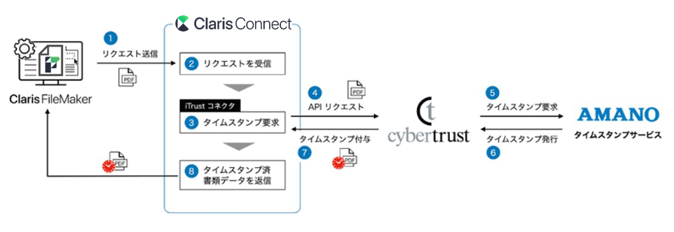 「iTrust リモート署名サービス」と「Claris Connect」との API 連携により、「Claris FileMaker」など各種アプリケーションで管理された電子データに対して、電子帳簿保存法の要件に準じた総務大臣認定のタイムスタンプ付与により、高い信頼性と真正性を確保することが可能です。