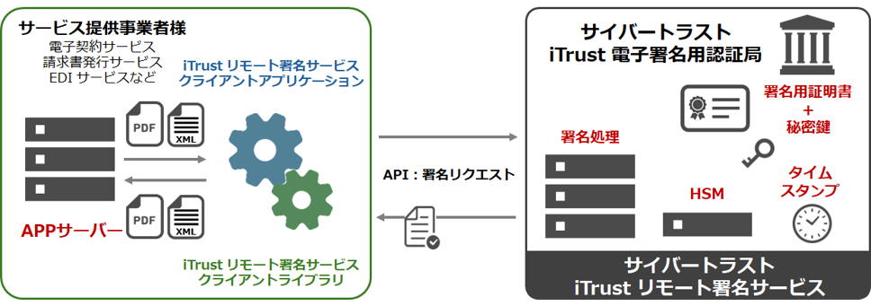 iTrust リモート署名サービスは、請求書や EDI など取引データの電子署名・eシール付与、電子契約で求められる電子文書の長期間に渡る真正性を確保する長期署名に対応したクラウドサービスです。