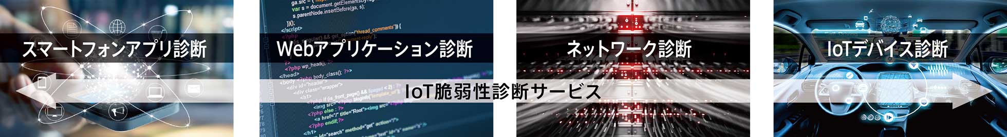 IoT 脆弱性診断サービスは、IoT デバイス診断に加え、システムを構成するネットワーク、Web アプリケーションなどの診断を横断的に診断いたします。これにより IoT サービス全体の総合的な脆弱性診断サービスをご提供します。