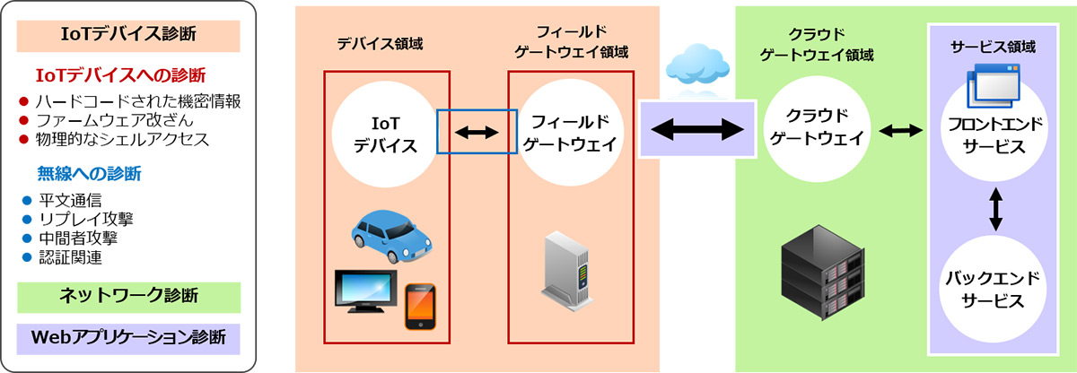 IoT 脆弱性診断サービスは、Web アプリケーション診断、ネットワーク診断、スマートフォンアプリ診断 などの既存診断サービスに、IoT デバイス診断を加え「IoT 脆弱性診断」として、横断的に IoT サービス全体の総合的な脆弱性診断サービスをご提供します。