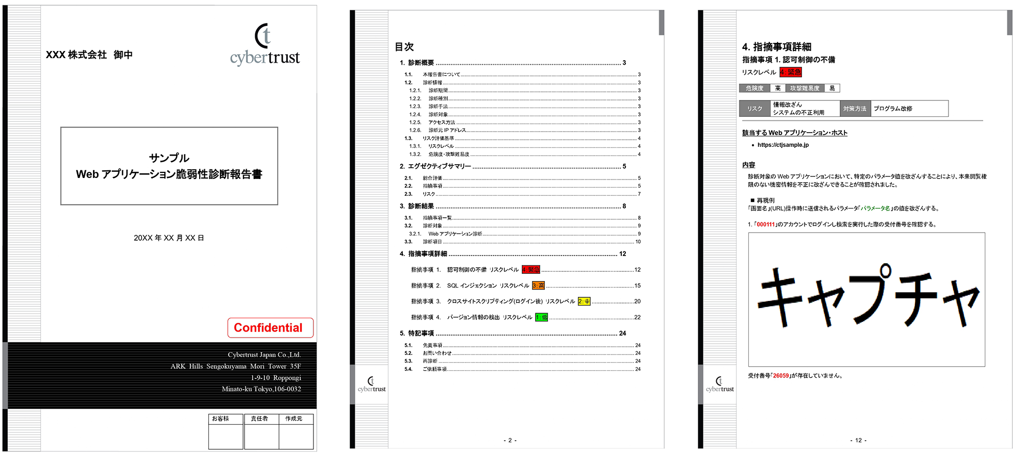 診断結果は「診断報告書」として提出いたします。診断報告書は、経営層向けのエグゼクティブサマリー(5段階の評価ランクを含む)と技術者向けに詳細レポートとして、確認された脆弱性および対策などを記載し、お客様が改善すべき事項を明確にご提示します。