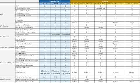 当社が取り扱いしておりますもうひとつの WAF 製品「WAF Plus」で採用しております、Imperva 社製品「App Protect Essentials」を始めとした Imperva 社の各サービスと攻撃遮断くんとの機能比較表をご用意しております。