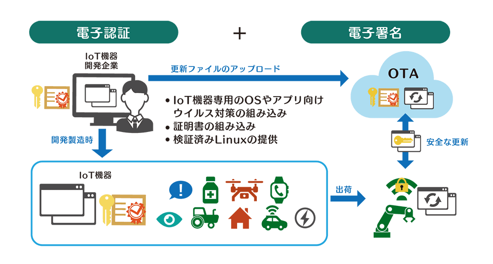 IoT機器の安全な運用には、セキュリティ機能を含め機器を最新の状態に保つファームウェアアップデートが不可欠です。セキュア IoT プラットフォームのリモートアップデート (OTA = Over the Air)機能は、電子署名と公開鍵暗号の技術を利用した安全なソフトウェア更新を実現。デバイス管理と連動して、配信先のIoT機器に対して常に正しいFWバージョンを配布します。