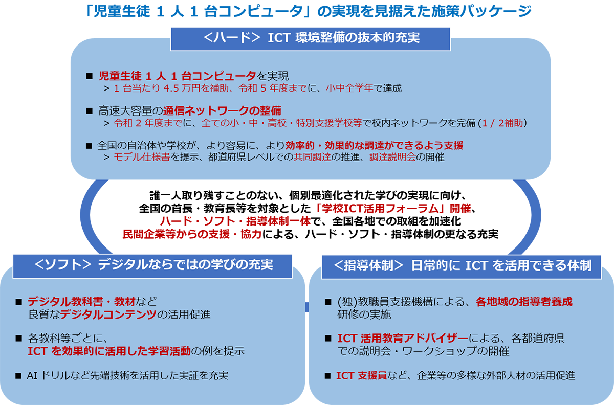 政府は、児童生徒向けの1人1台端末と、高速大容量の通信ネットワークを一体的に整備するための予算化をはじめ、2020年度から始まった新学習指導要領を着実に実施していくとともに、教育課程や教員免許、教職員配置の一体的な制度の見直しや、研修等を通じた教員の ICT 活用指導力の向上、情報モラル教育をはじめとする情報教育の充実など、ハードウェア・ソフトウェアの両面からの教育改革に取り組むためのGIGA スクール構想を推進しています。