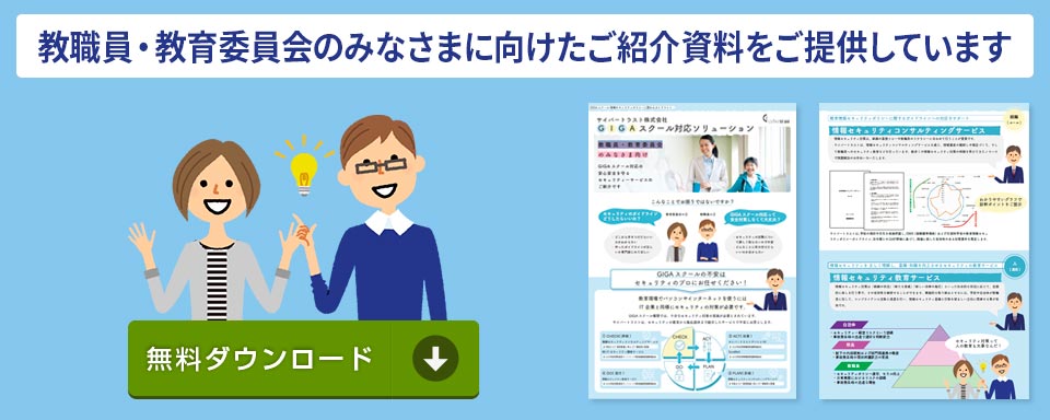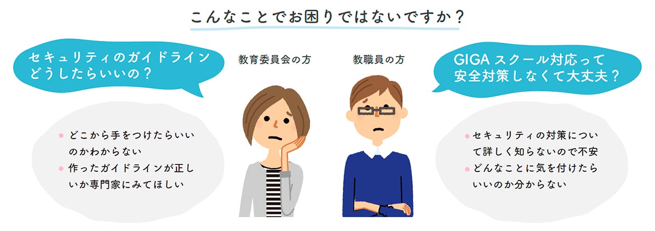 教育現場でパソコンやインターネットを使うには IT 企業と同様の情報セキュリティ対策が必要です。GIGA スクールの不安はセキュリティのプロにおまかせください。セキュリティの教育から製品提供まで総合したサービスで不安にお答えします。