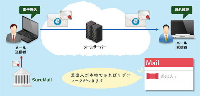 SureMail は差出人の確認と内容が書き換えられていないことの確認を電子メールの受信者が容易に確かめることができる技術です。
