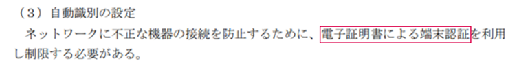 強固なアクセス制御において「電子証明書による端末認証を利用し制限する必要がある」と明記されており、電子証明書を教職員ならびに児童生徒が利用する個々の端末へインストールすることにより、電子証明書を持つ端末のみアクセスを許可するといった仕組みです。