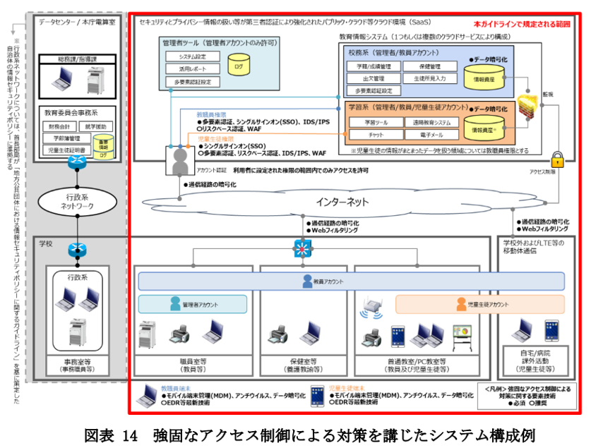 改訂された「教育情報セキュリティポリシーに関するガイドライン」では、不正アクセス対策として利用者認証(多要素認証)、端末認証、アクセス経路の監視・制御などを組み合わせたセキュリティ対策を「強固なアクセス制御」と表現し、複数ページに渡って言及しています。