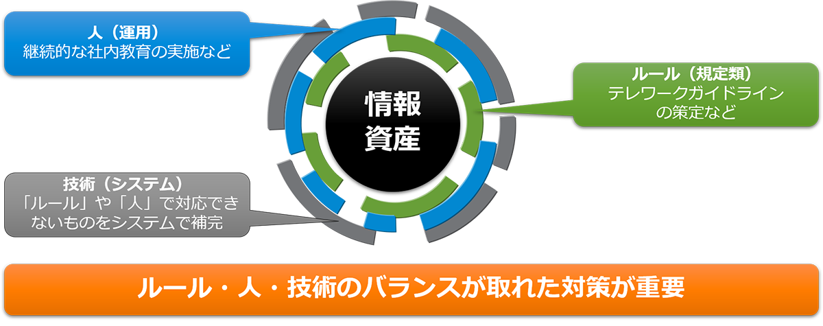 パスワードをふせんに書いてノート PC に貼り、コワーキング施設でパソコンにログインしたまま昼食に出かけた、というリスクは技術では防げません。長期的に、かつ、効果的にテレワークを運用するにあたって、ルール作りや従業員教育は欠かせない要素です。