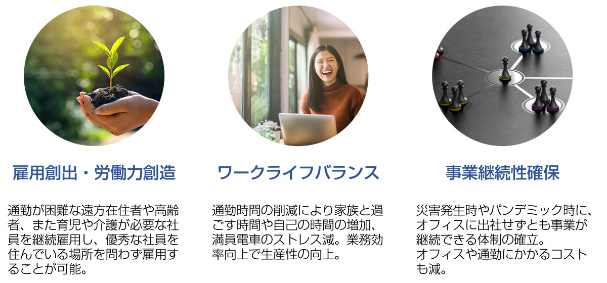 - オフィスから遠く離れた場所に居住しつつ仕事をすることも可能となり、地方における就業機会の増加も期待されます。国内外を問わず優秀な人材を採用することも可能です。