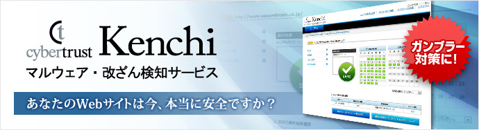 Kenchi は、Web サイトの改ざんの有無を定期的に確認し、安全確保を継続的に支援するセキュリティーサービスです。