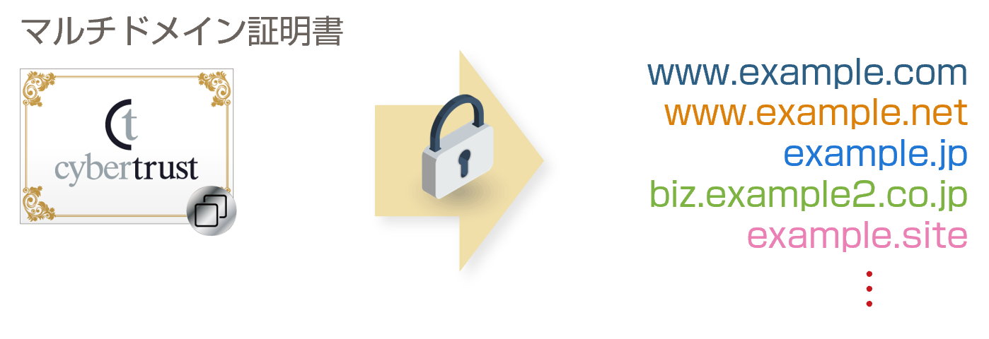 マルチドメイン証明書は、所有する複数のサイトを 1 枚の証明書で保護します。サブドメインや別ドメインを 1 枚の証明書にまとめることで、管理コストやライセンスコストを抑えることが可能です。