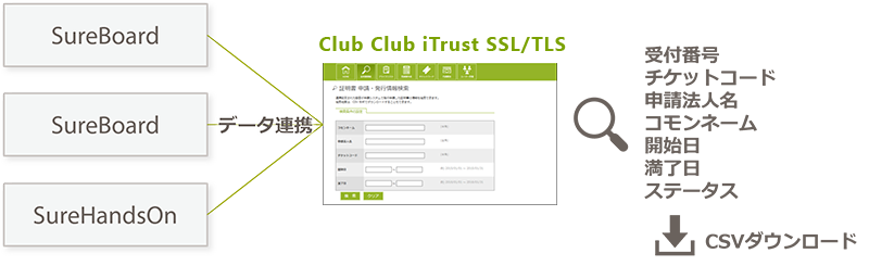 複数の SureBoard/SureHandsOn アカウントの証明書情報を、Club iTrust SSL/TLS を通じて一元管理できます。ウェブ上で検索・参照することはもちろん、CSV 形式でダウンロードすることもできます。