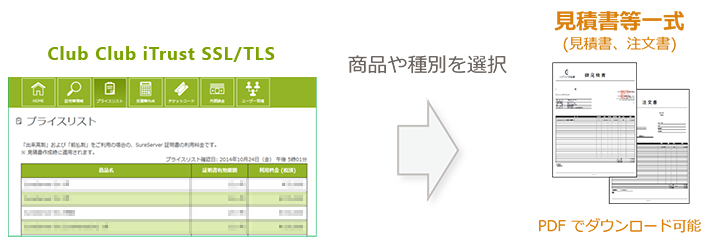 Club iTrust SSL/TLS では、当社とご契約いただいたパートナープライスで料金を表示します。また、パートナープライスをベースにしたお見積書などをオンラインで即時発行いただけます。