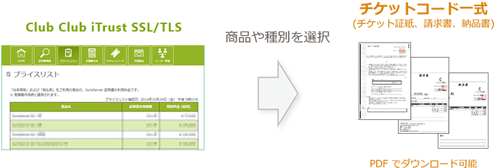 Club iTrust SSL/TLS では、オンラインで iTrust SSL/TLS サーバー証明書 チケットをご購入頂くことができます。ご購入頂いた iTrust SSL/TLS サーバー証明書 チケットのチケット証紙は、PDF 形式でダウンロードが可能ですので、急なご要望にも対応できます。