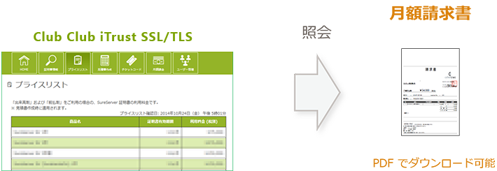所定の条件をみたしたパートナー様へは、ご契約頂いている証明書件数に応じて月ごとにお支払いを頂く、月額課金サービスをご提供しております。 Club iTrust SSL/TLS では、月額課金サービスの証明書情報管理や請求書の照会・ダウンロードが可能です。