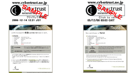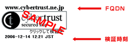 iTrust SSL/TLS サーバー証明書の FQDN と、サイバートラストによる検証時刻が Trusted Web シールに表示されます。