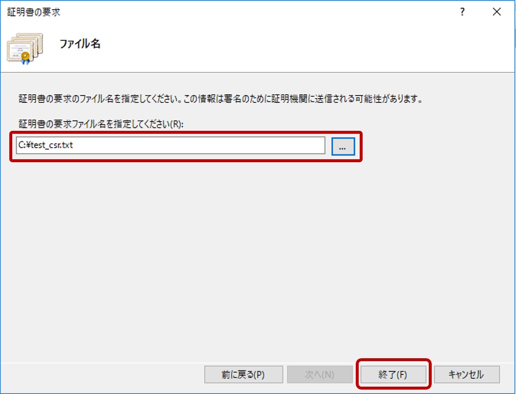 CSR のファイル名と保存先を指定し、【終了】をクリックします。