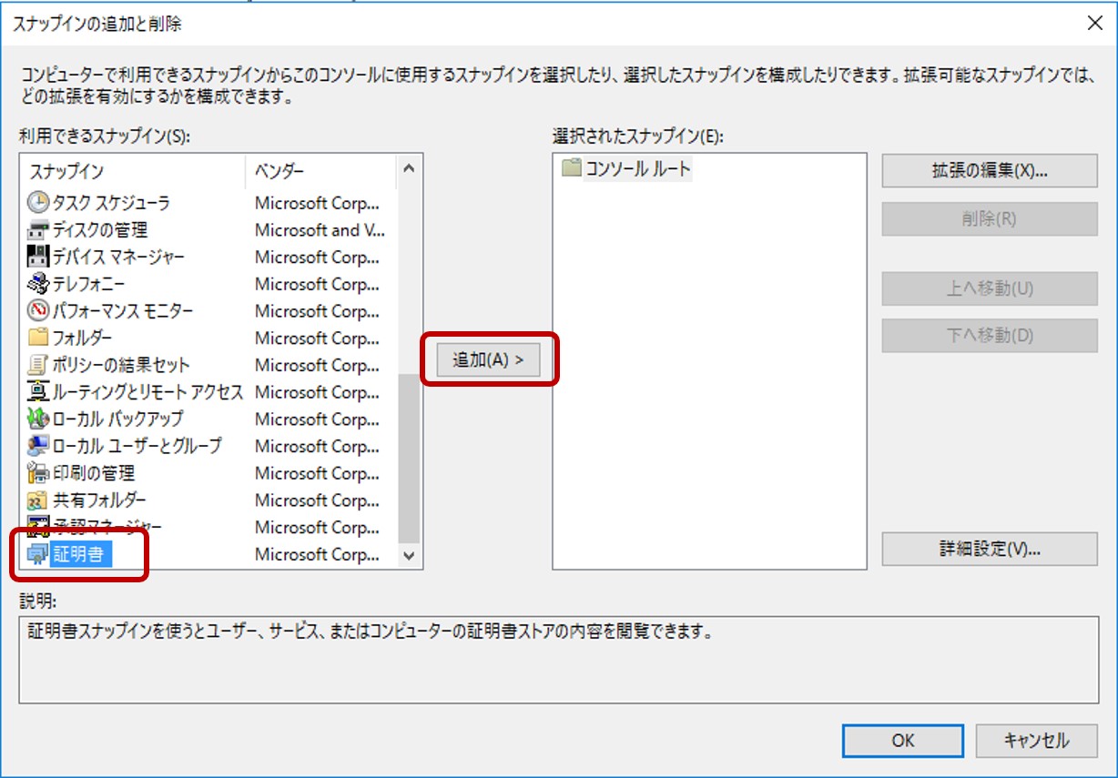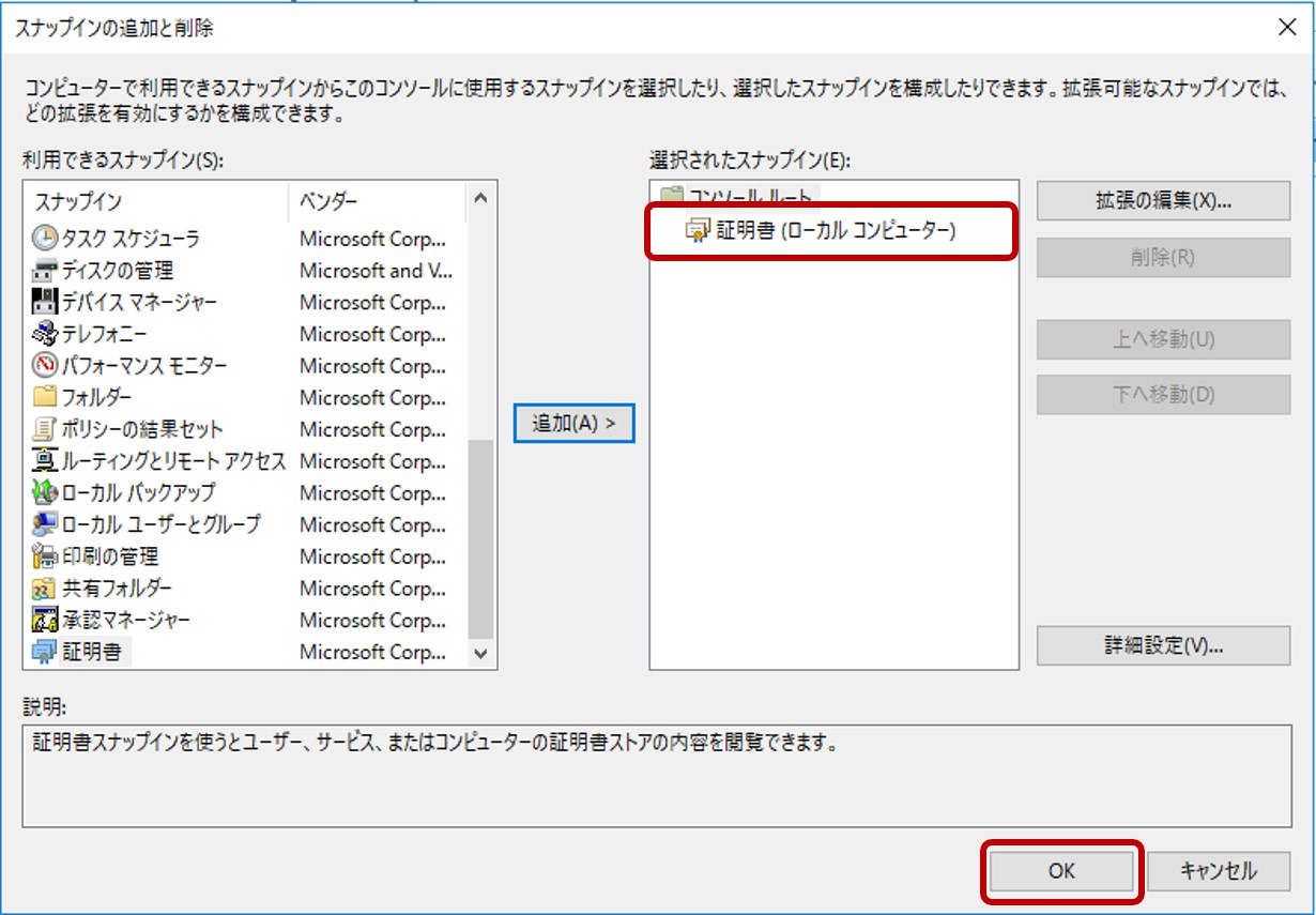 【選択されたスナップイン】に【証明書(ローカルコンピューター)】が追加されていることを確認し、【OK】をクリックします。