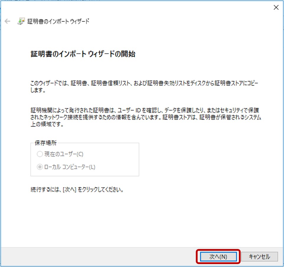 証明書のインポートウィザードが表示されますので、【次へ】をクリックします。