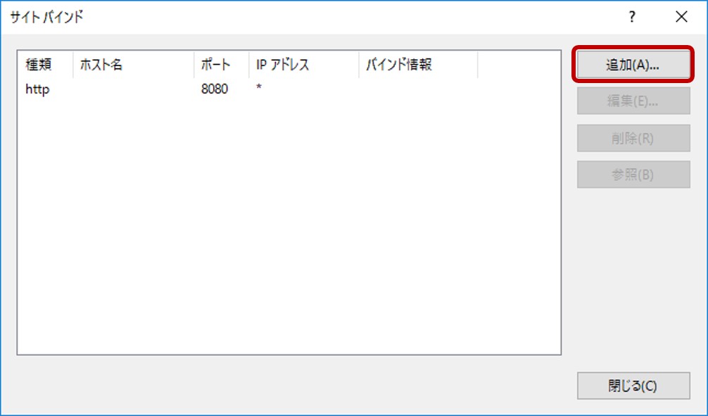 「サイトバインド」画面が表示されますので、新規の場合は【追加】をクリックします。