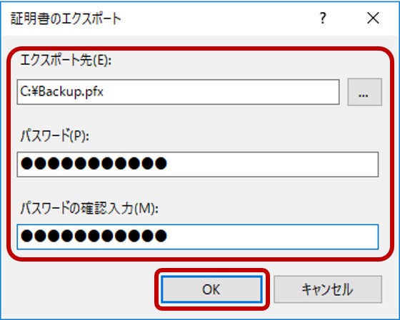 【エクスポート先】に保存先のフォルダとファイル名を指定します。ファイルの拡張子は【.pfx】を指定し、【パスワード】、【パスワードの確認入力】に同じパスワードを入力し、【OK】をクリックします。