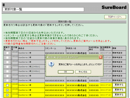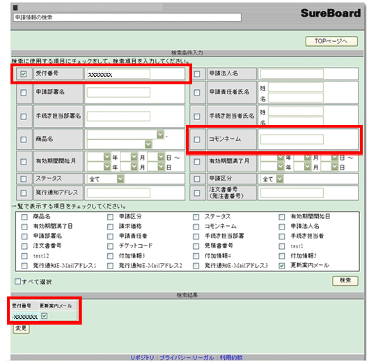 - SureBoard/SureHandsOn にログイン後、「申請情報の検索」から、更新の案内をとめたい受付番号や、コモンネームを入力し、一覧で表示する項目の「更新案内メール」にチェックを入れ、「検索」を押してください。