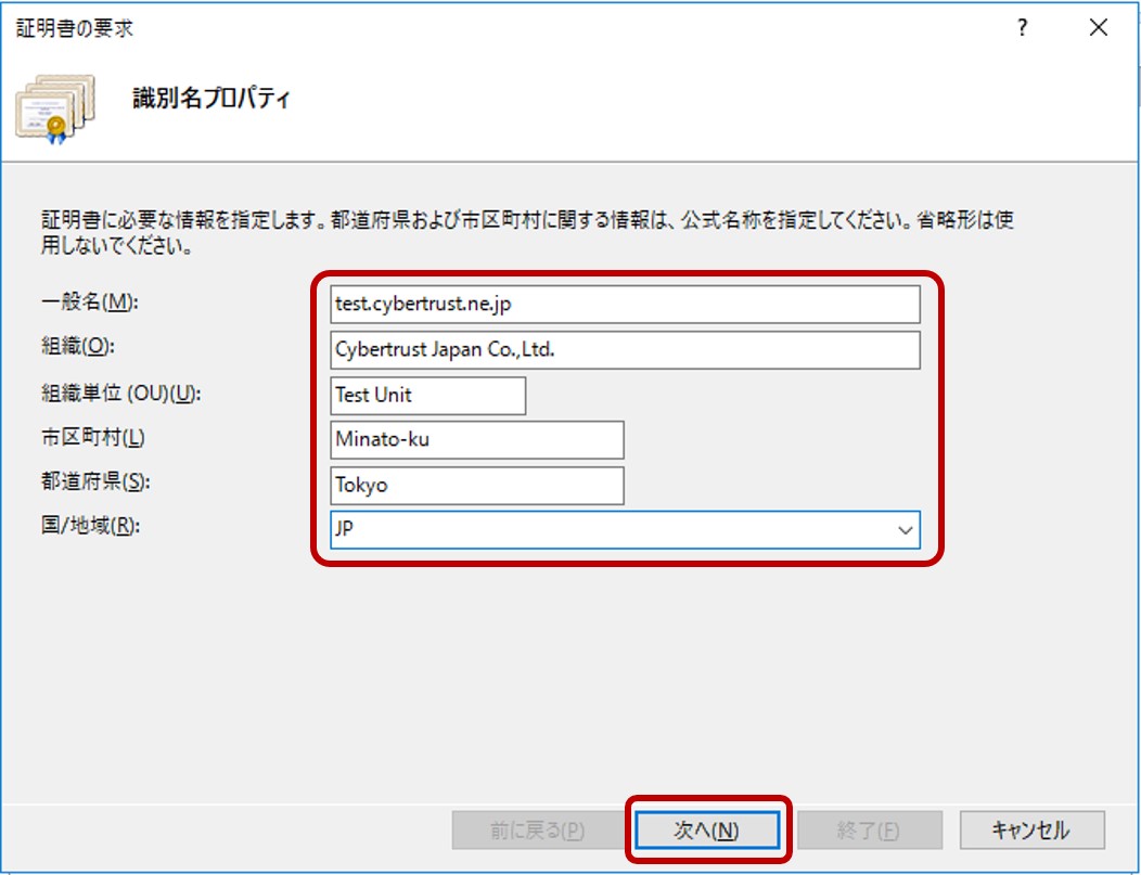 識別名プロパティを入力する画面が表示されますので、CSR に設定する情報を入力して、【次へ】をクリックします。以下のルールに従って正確に入力してください。