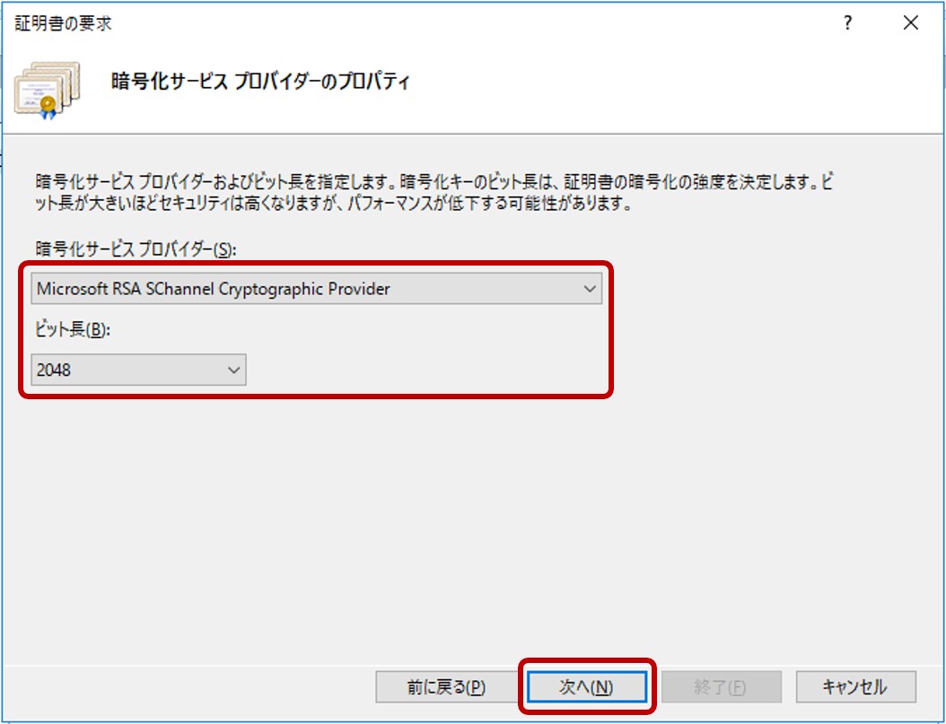 【暗号化サービス プロバイダー】は、表示された情報(Microsoft RSA SChannel Cryptographic Provider)を選択し、「ビット長」は「2048」と指定してください。