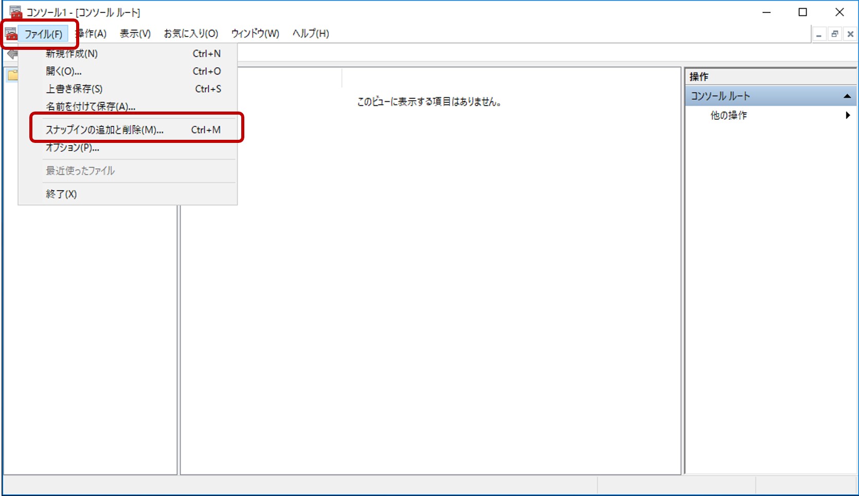 MMC 画面左上の【ファイル】メニューをクリックし、【スナップインの追加と削除】をクリックします。