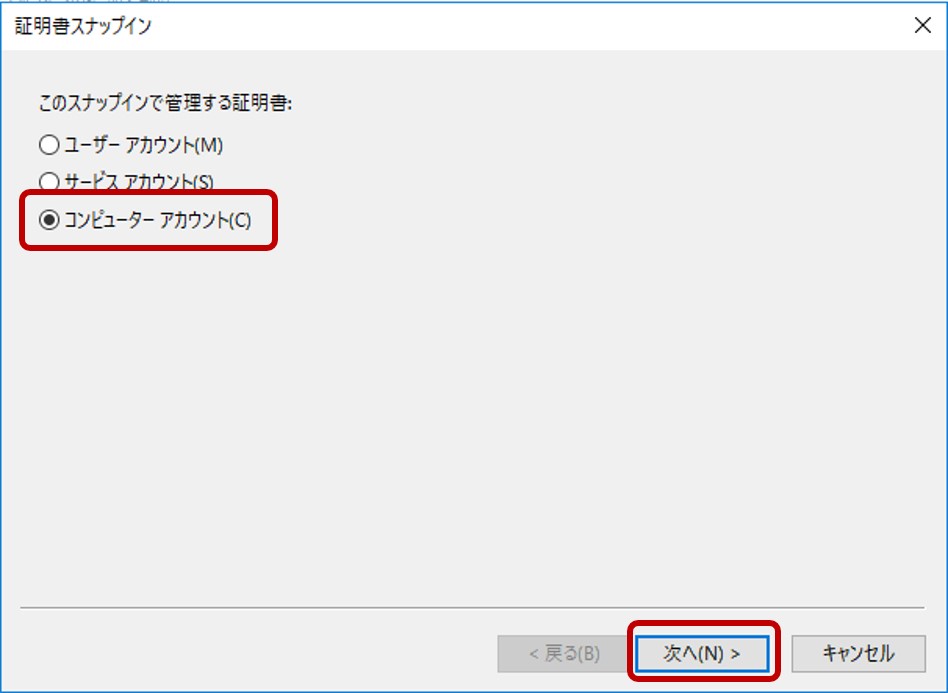 【コンピューターアカウント】を選択し、【次へ】をクリックします。