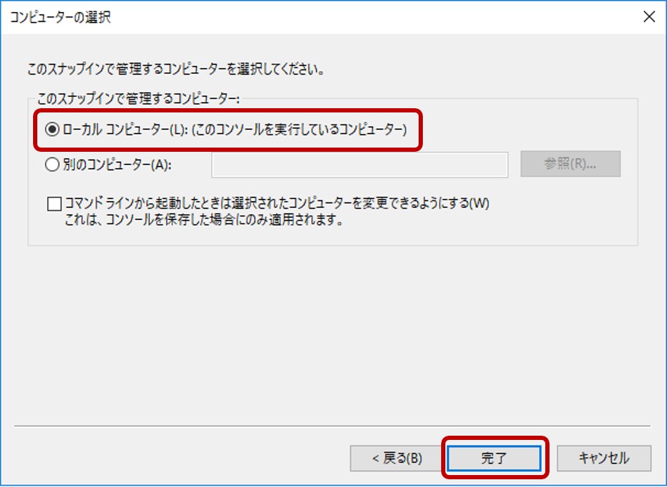 【ローカルコンピューター(このコンソールを実行しているコンピューター)】を選択し、【完了】をクリックします。