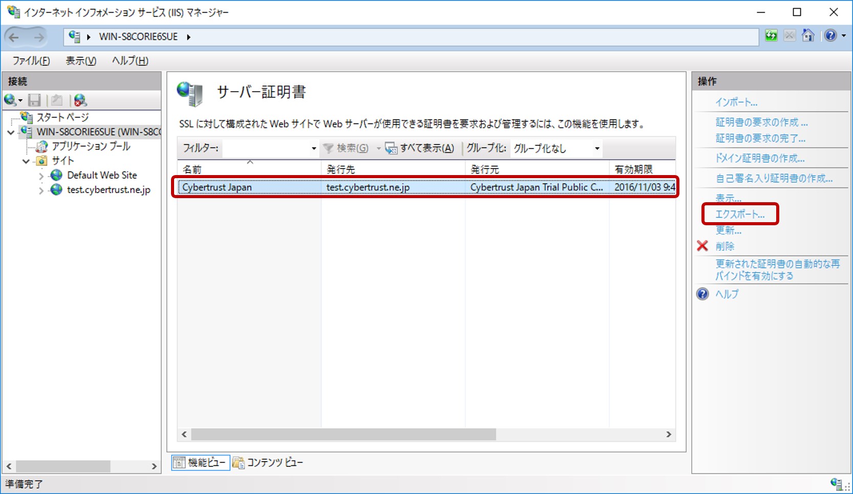 バックアップしたい SSL/TLS サーバー証明書を選択し、画面右側の操作メニューから【エクスポート】をクリックます。
