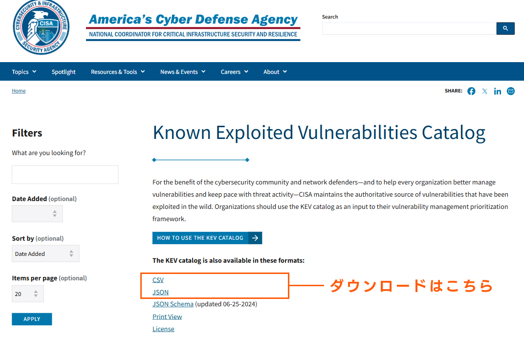 CISA公式からKEVカタログをダウンロード(CSV, JSON)