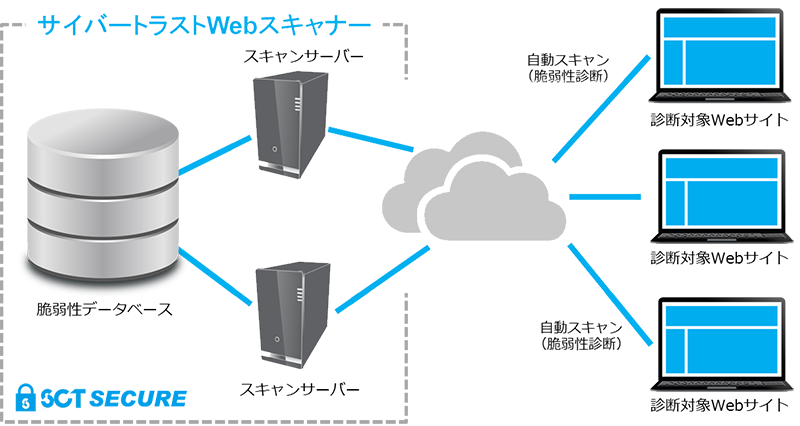 サイバートラスト Web スキャナーは、診断ツールを用い、Web サイト内のアプリケーションやネットワーク機器の脆弱性を外部からスキャンし、診断を行うサービスです。