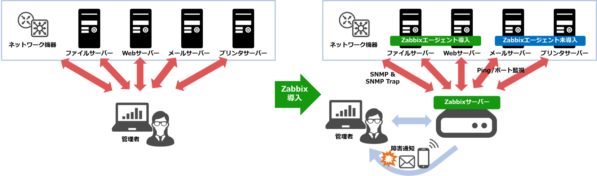 Zabbix とは、サーバー、ネットワーク、アプリケーションを集中監視するためのオープンソースの統合監視ソフトウェアです。統合監視に必要な監視、障害検知、通知機能を備えています。多数のプラットフォームに対応した Zabbix エージェントと SNMP に対応しているため、システム全体を Zabbix ひとつで監視することが可能です。