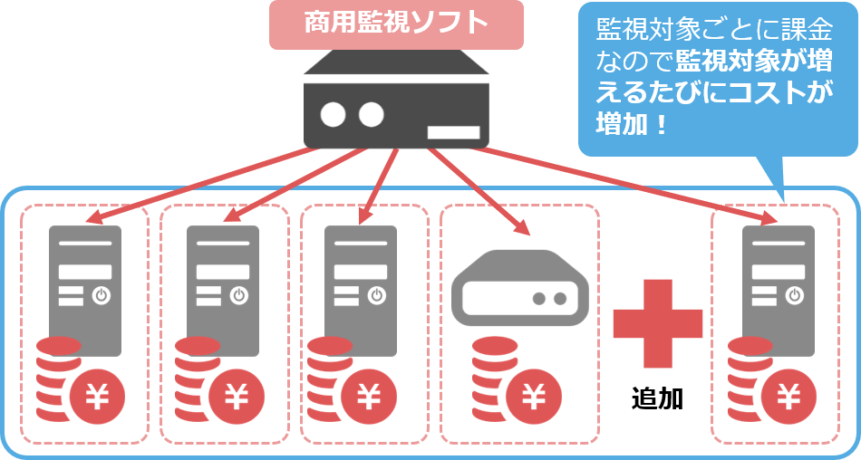 監視対象の数に依存した価格体系では、監視対象が増えれば増えるほど全体のコストも高くなります。特に仮想化によるサーバー統合が検討されている昨今では、リソースの増減が激しくなるために、見積りしにくいという欠点もあります。