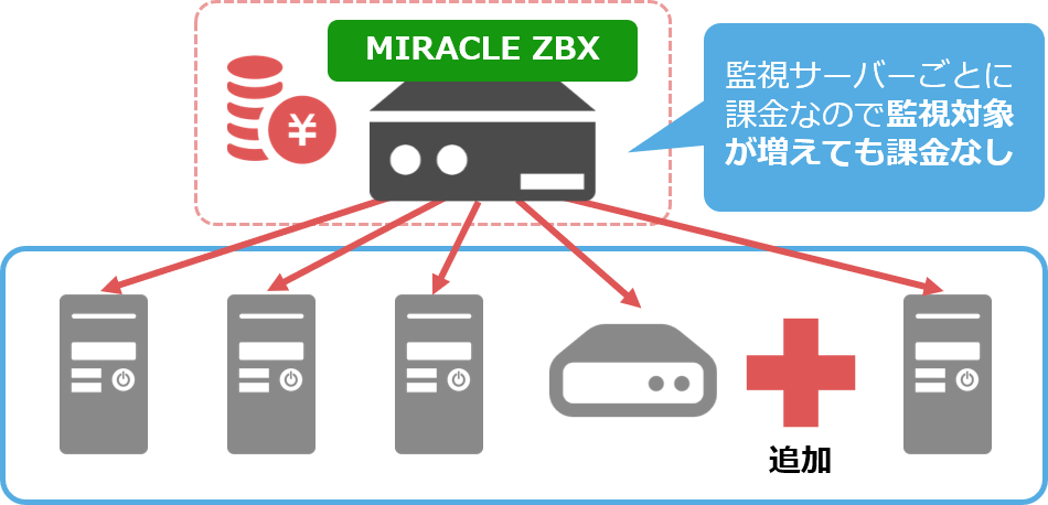 MIRACLE ZBX は、監視サーバー 1 台ごとの価格体系なので見積もりもしやすく、監視対象の増減に依存しません。商用の監視ソフトウェアの場合