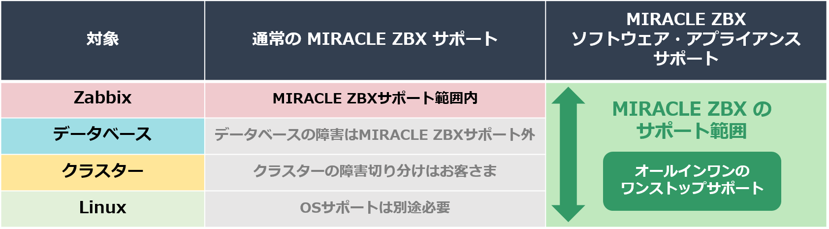 本サポートサービスは MIRACLE ZBX だけでなく、MIRACLE ZBX が構築されている AlmaLinuxOS のサポートも包括しています。