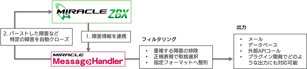 また MIRACLE ZBX で検知した障害情報を解析し、バーストした障害や、不要な障害を自動でクローズしたりなど、運用担当者の負担を減らすようなフローを実装することも容易です。