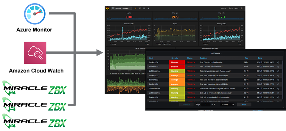 複数の MIRACLE ZBX、Zabbix や クラウド上の障害、ログ、メトリクスを
